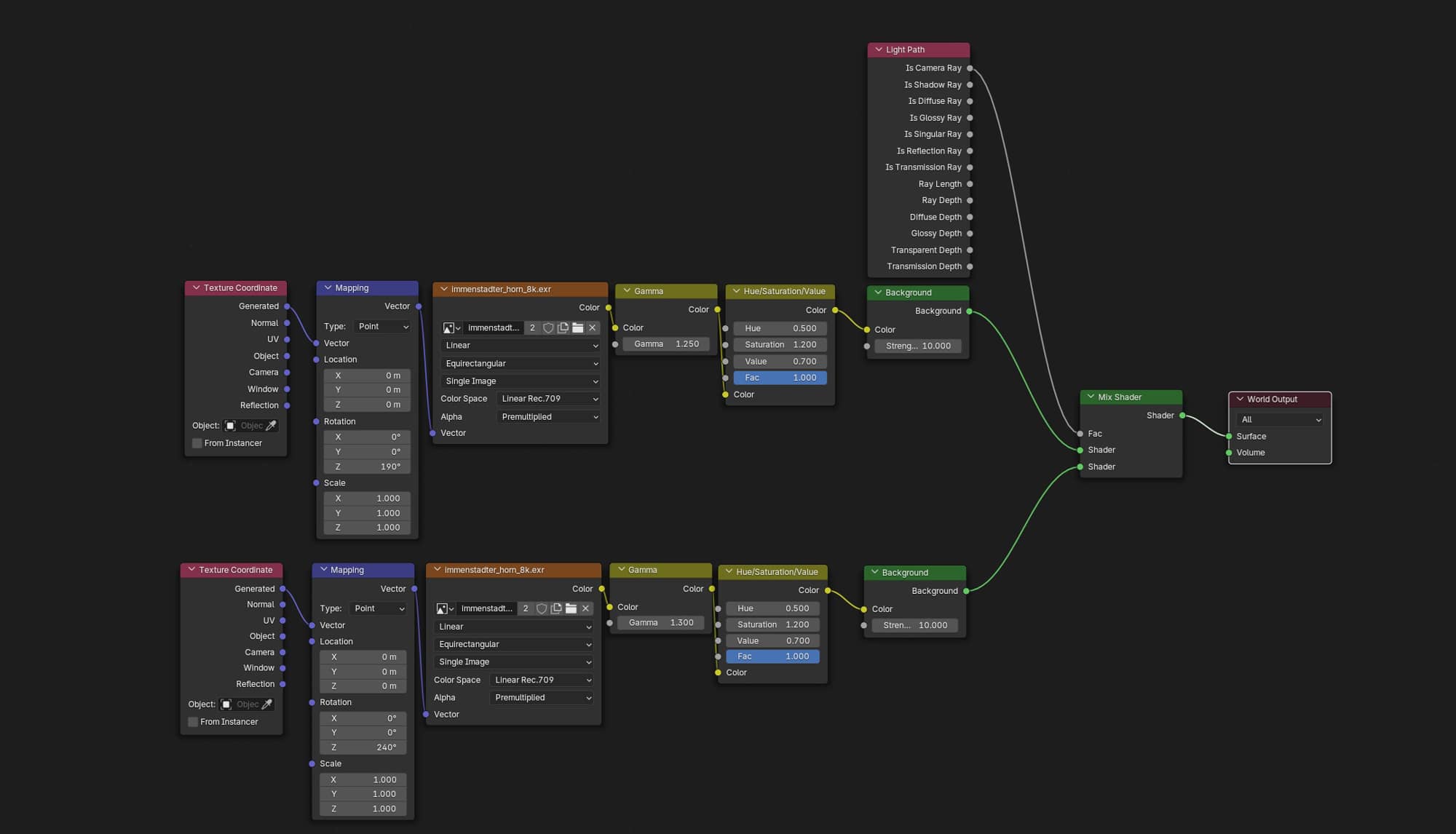 The upper node tree, combining a Light Path node with a Mix Shader, allows precise control over how much light the HDRi emits. This setup can let the HDRi illuminate the scene without being directly visible to the camera—or the other way around.